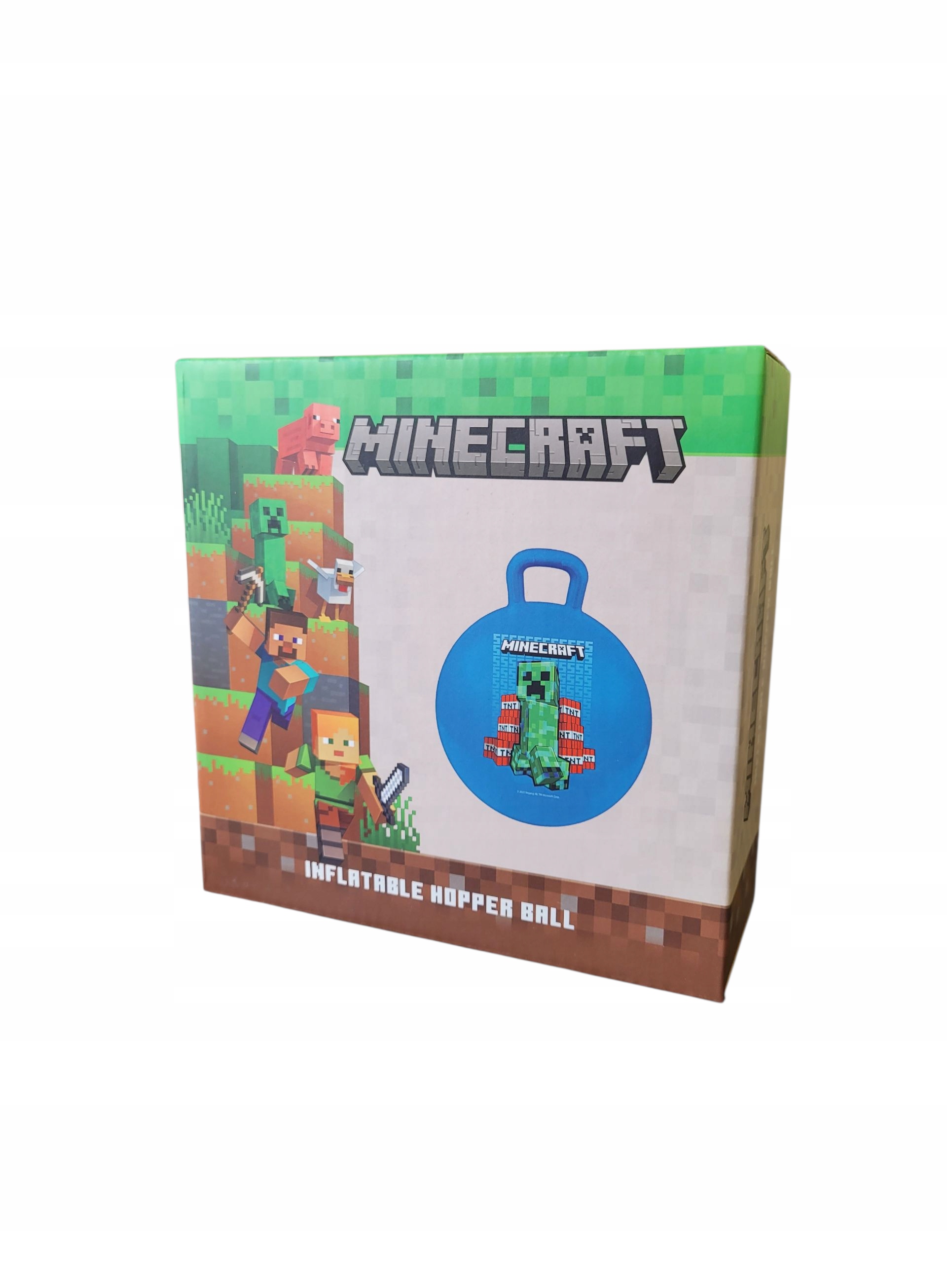 Piłka do skakania jest w kolorze jasno niebieskim posiada uchwyt do chwytania. Została ozdobiona kolorową grafiką przedstawiającą głównych bohaterów MINECRAFT